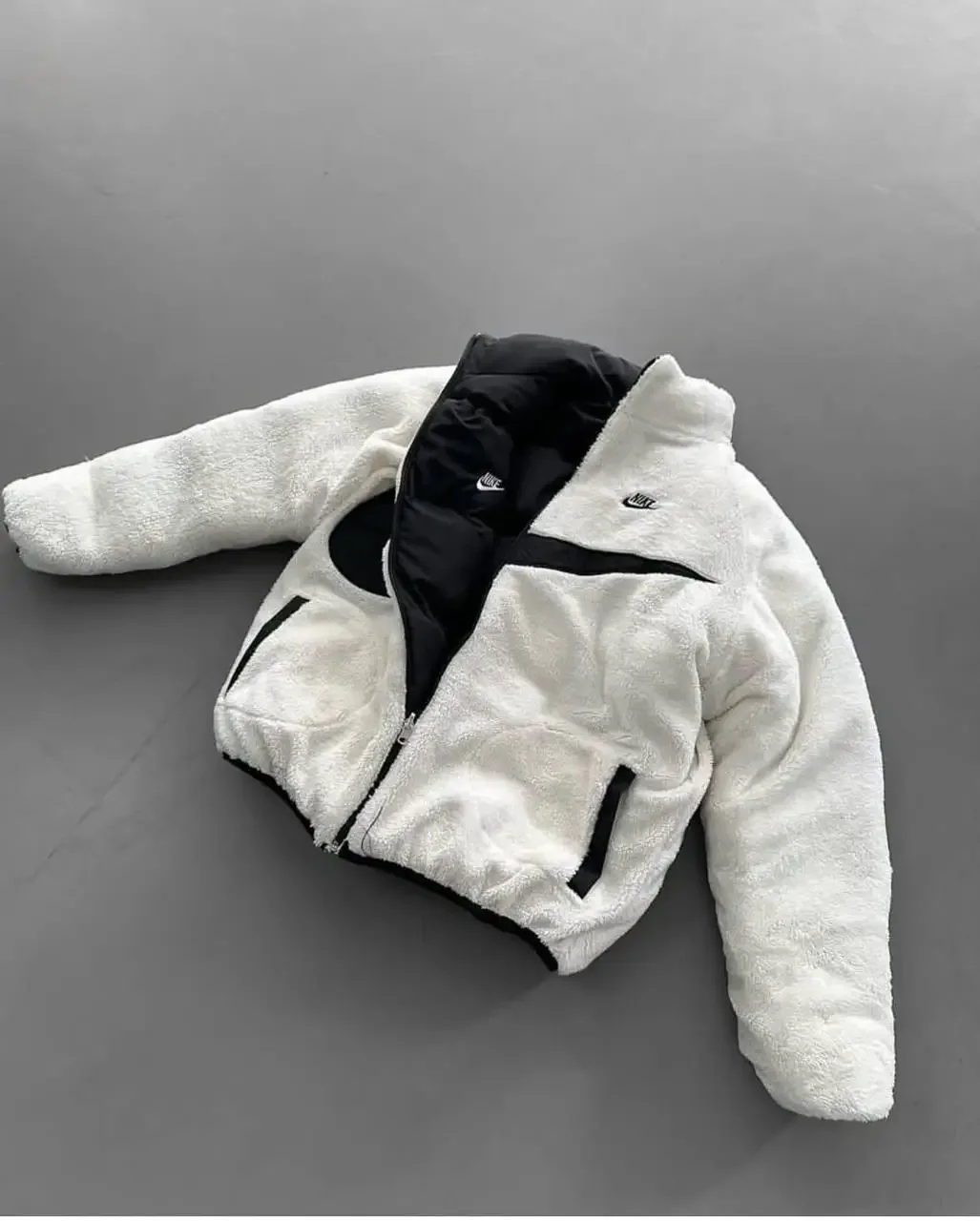 سترة Nike ثنائية الاستخدام هي في الأساس سترتان في واحدة. وكلا الجانبين رائعان. نسيج صوف أبيض سميك وناعم من المستحيل أن تفوتك. قطعة مميزة تمامًا. ثم، تقلبها من الداخل إلى الخارج. وتصبح سترة مختلفة تمامًا. سترة سوداء كلاسيكية أنيقة.